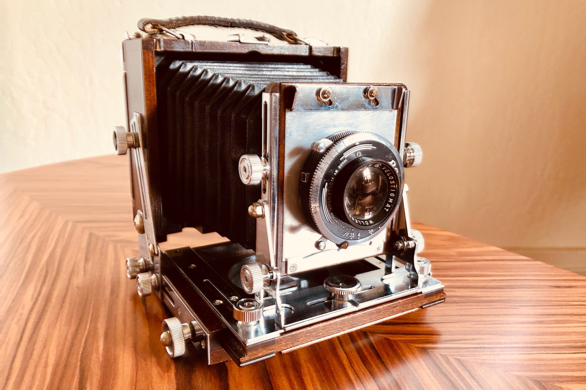 This little wooden 6x9 field camera is a Tachihara Shirom. While the movements are a bit limited both standards can be moved together to provide good support for wide angle lenses. The ground glass, which conveniently flips out of the way, is designed to take a Graflok roll film back, which is great if you want to shoot film. However, digital backs won’t fit the 2x3 Graflok back due to the where the film sits relative to the locking mechanism.