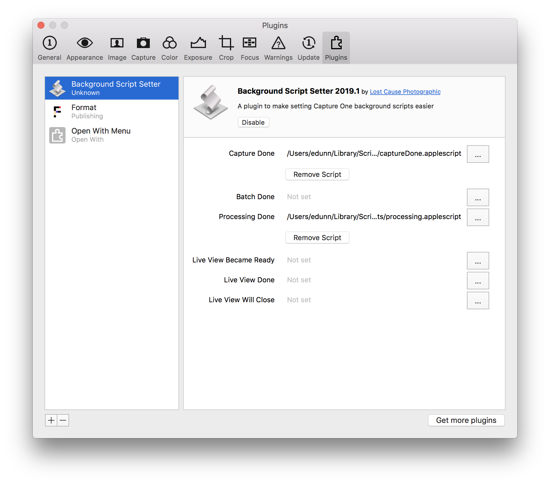 However, I wanted an easier option. Plugins were introduced in Capture One 12, and because plugins can display UI in preferences they're the perfect way to show the background scripts.