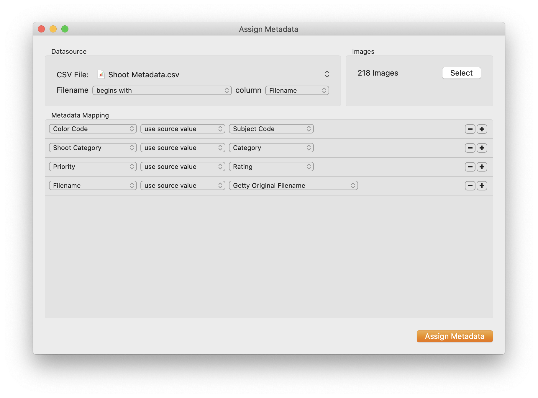Capturebot will read a CSV, parse the metadata inside, let you map the fields your DAM uses to real EXIF tags, and then assign everything to the correct images.