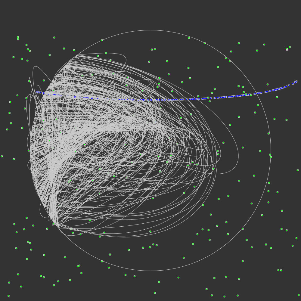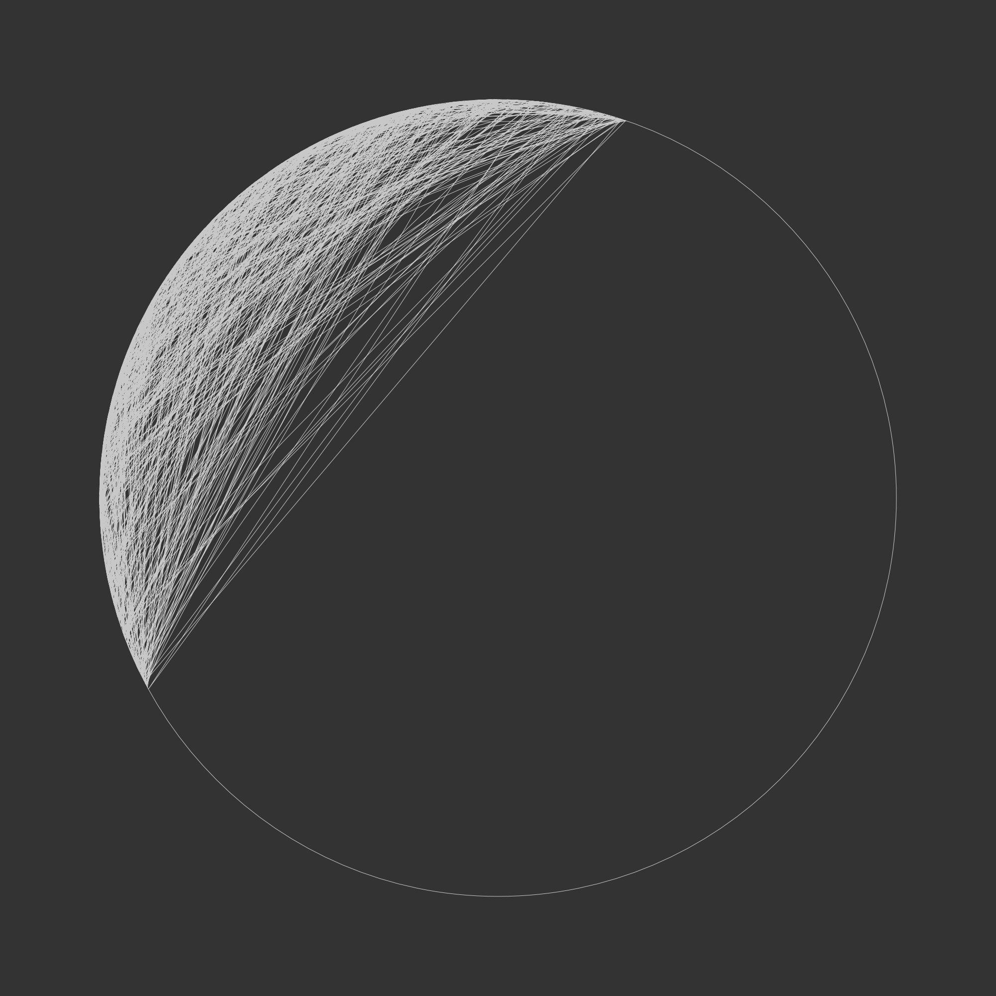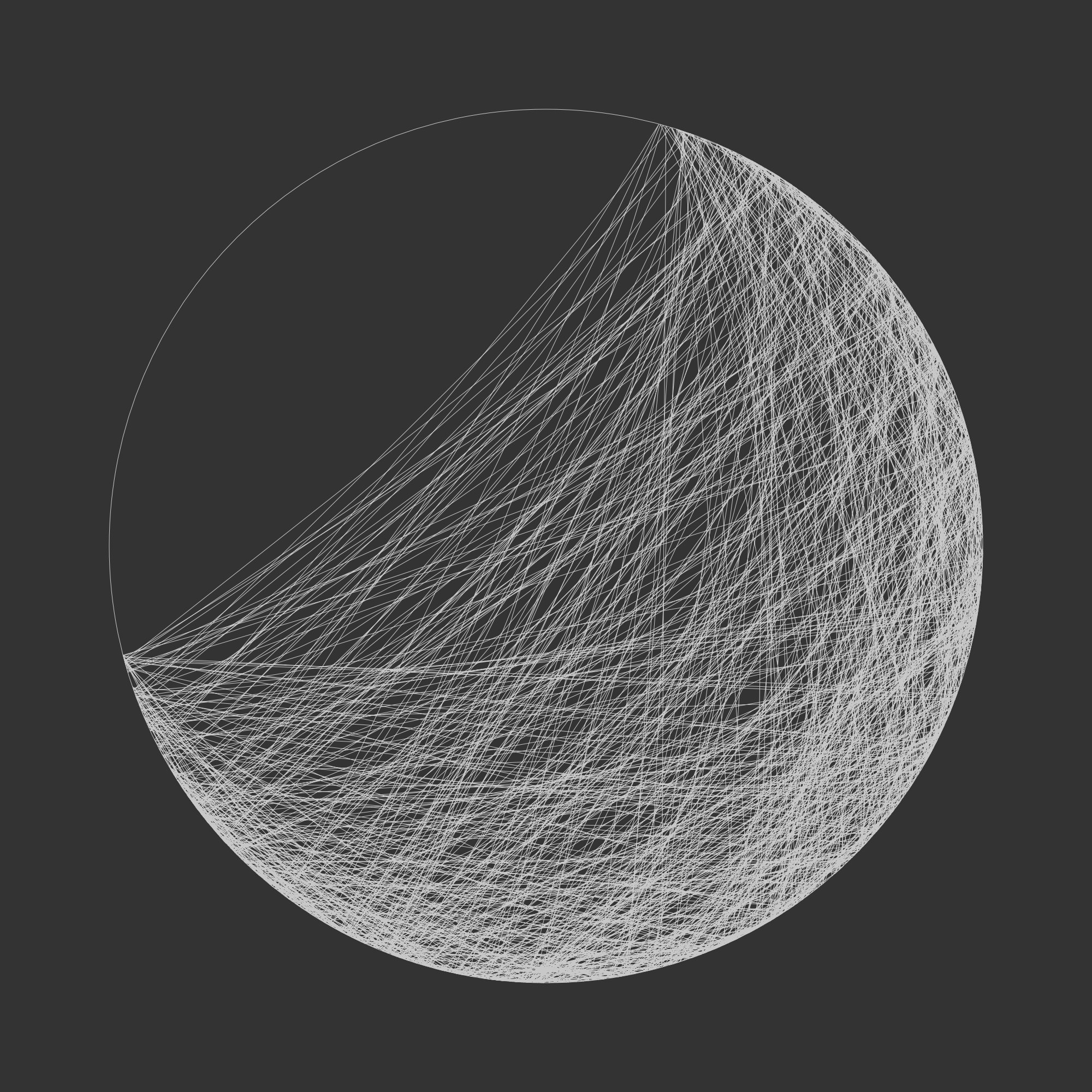 I started off by connecting random vertices on the edge of a circle to one another, creating a random web of lines. Eventually I added a limit to the angles in which the vertices could be, which adds a more abstract character. After adding randomization to all of the parameters, I just kept rendering new images.