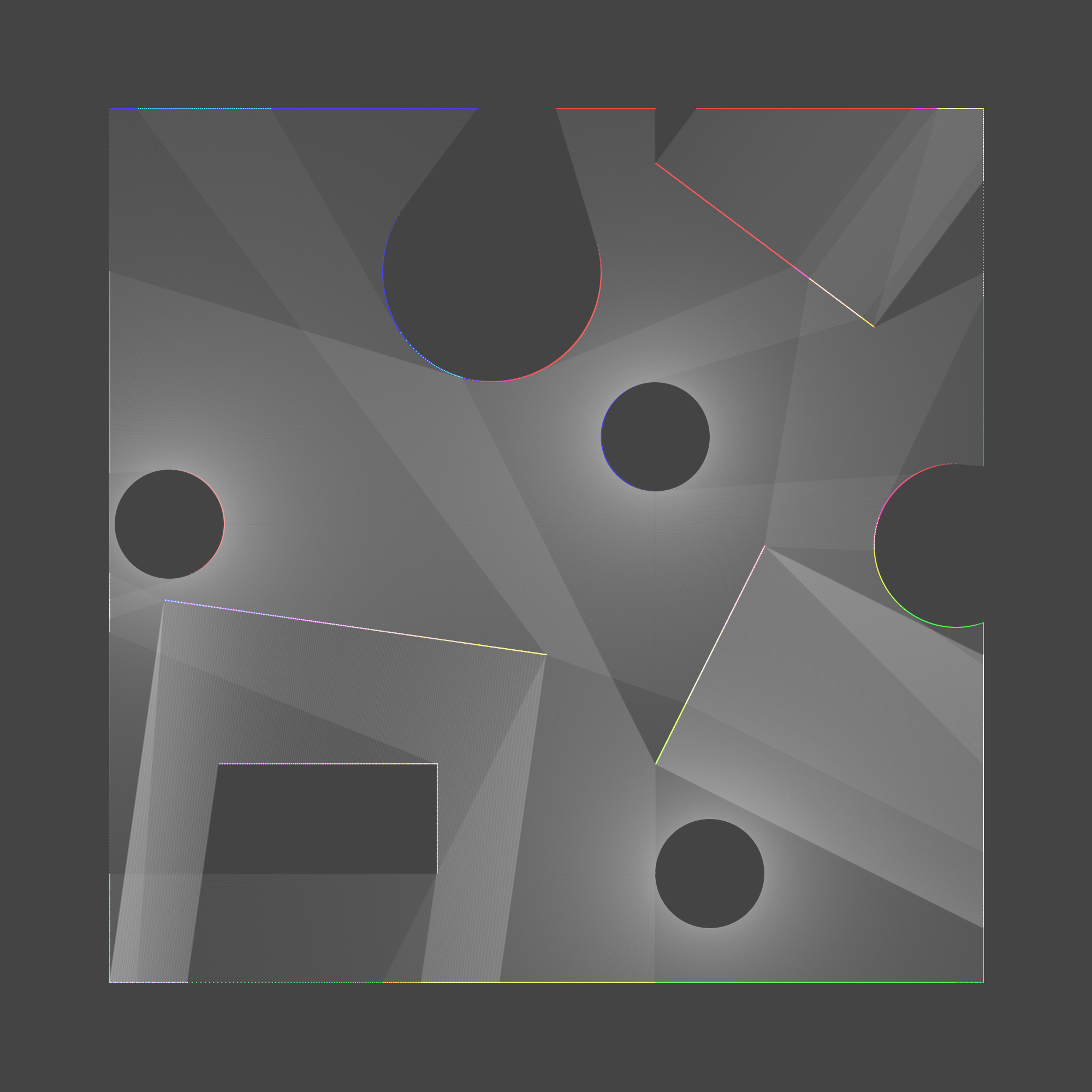 One of the main reasons for wanting to build my own library was to make a nicer ray tracing system. I’d made a simple version in P5.js, but the idea of adding more features using JavaScript was… unappealing. After the basics (circles, rectangles) I wanted to add Fresnel lenses.