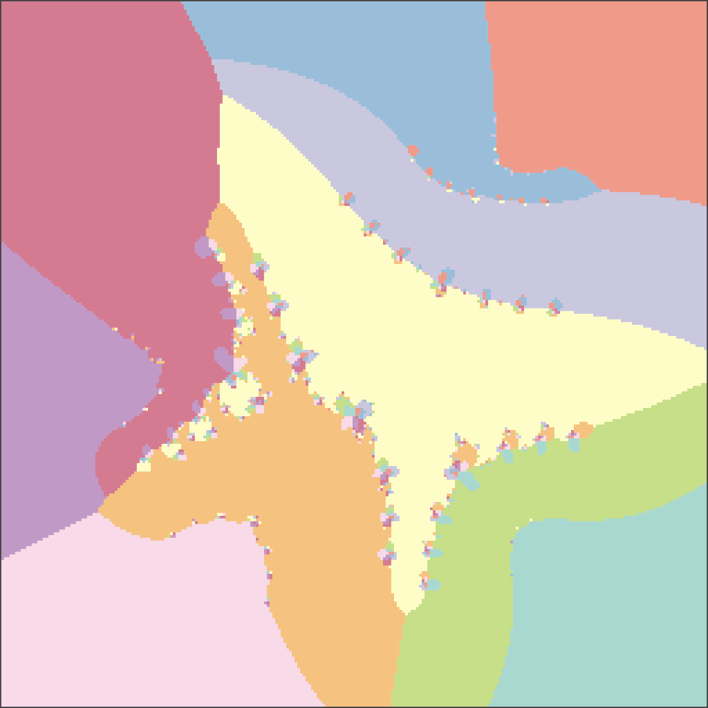 After I had the math part done I could turn my attention to the graphics part. I started off with simple black lines, but one of the more interesting elements of the fractal is which root a points converges on. With this in mind I added colors to the lines, tracing the paths to each root value.